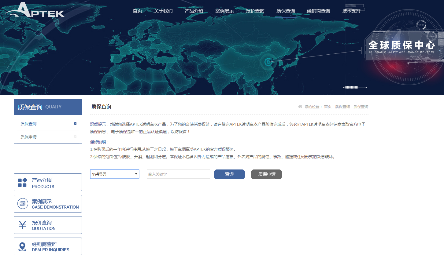 作用:透明车衣行业内唯一敢于终身质保品牌,Aptek把每一位顾客的质保信息录入系统,可通过官网查询,方便客户查询质保和行使质保权,并签约质保,对客户利益进行双重保障